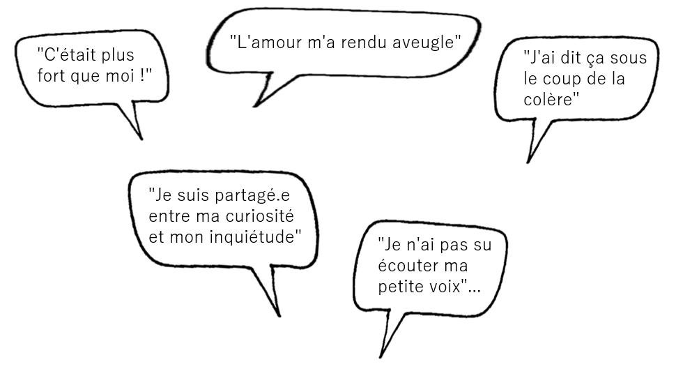 Une qui veut affirmer son désaccord alors qu'une autre préfère préserver la relation. Une qui veut avancer et une qui n'aime pas l'incertitude. Une qui veut manger et l'autre qui juge. Une qui se met dans une telle colère qu'elle cache l'autre qui a un profond besoin de reconnaissance...